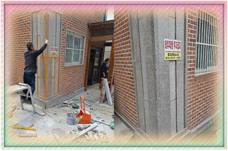 골조 및 조적, 블록 등에 물을 뿌린 후 석재를 설치합니다.